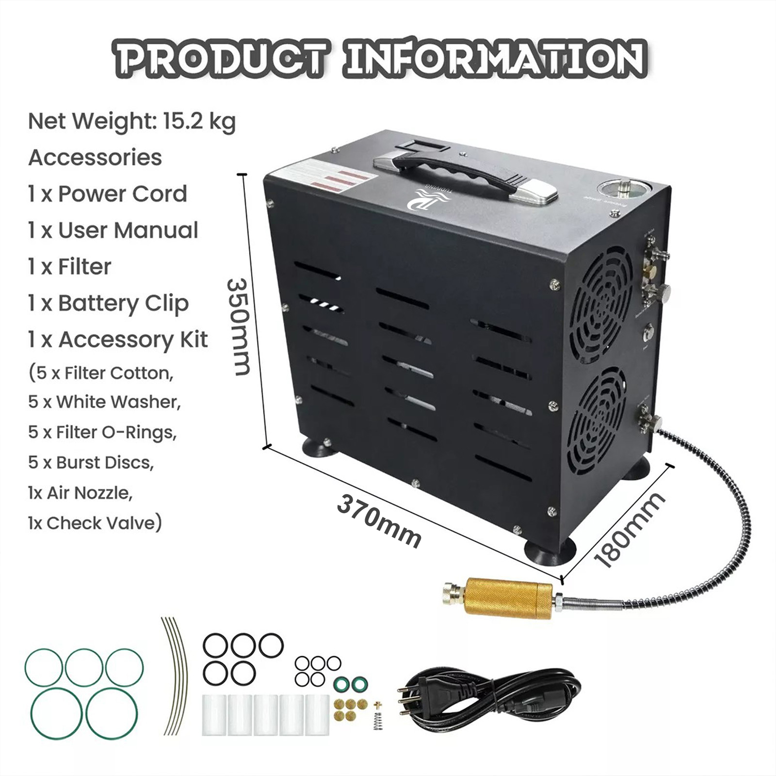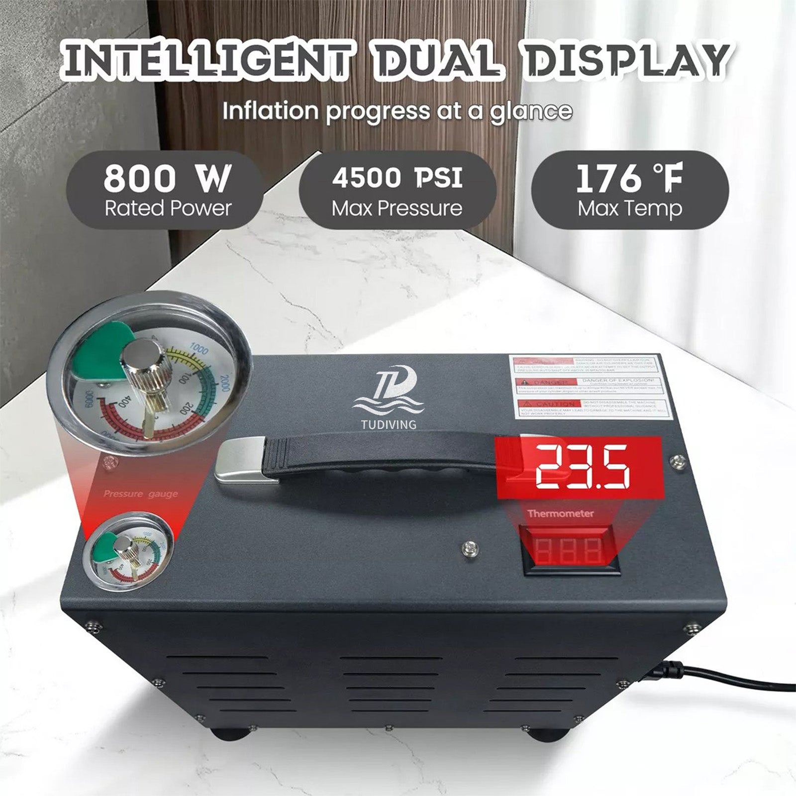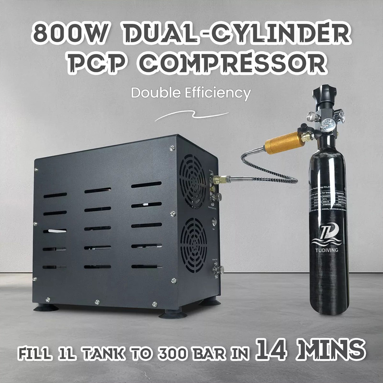 TUDIVING-4500Psi/300Bar Diving High Pressure Compressor,800W Dual-Cylinder PCP Air Compressor,Auto Stop,Scuba Compressorfor Fill a 2L Diving Tank